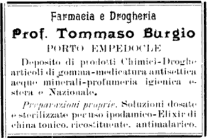 Alla guida della farmacia vi era Tommaso Burgio, una figura che sfugge alle definizioni semplici. Burgio non fu soltanto un farmacista nel senso stretto del termine. Accanto all’attività professionale, svolse un ruolo rilevante come insegnante di scienze naturali e merceologia presso la Regia Scuola commerciale “Nicolò Gallo” di Porto Empedocle, contribuendo alla formazione tecnica e scientifica delle nuove generazioni. In un centro in crescita come Porto Empedocle, la presenza di un docente con competenze scientifiche rappresentava un segno tangibile di maturità culturale e di apertura verso un sapere moderno e applicato.